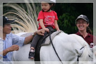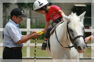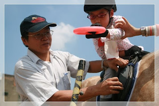 星期六我來到馬場時, 通常已經有一台「小黃」停在樹底下。裡面有一位中年男子在睡覺, 他就是李叔叔,PSA的企業志工。李叔叔剛下完大夜班,只在車上稍微休息一下,等一會兒他就要從九點鐘一直到十一點半鐘陪伴幾位來馬場參加馬術治療課程的小朋友。首先是一位上幼稚園的小女孩,她在嬰兒階段因一場車禍而傷到腦部,整個身體軟趴趴的。因為軀幹及頭部的控制很差,所以前十分鐘治療師會讓她橫趴在馬背上訓練她抬頭。初來馬場時小女孩在跨坐時需要很多的協助,以致陪走員的手臂一下子就會感到很酸,不過現在她已進步很多,只需要很少的扶助即可。小女孩的脾氣有時有一點扭,他不隨便接受陌生人陪她,如果李叔叔因故不能來,就只好請平常已經忙她忙到很累的家長來幫忙。