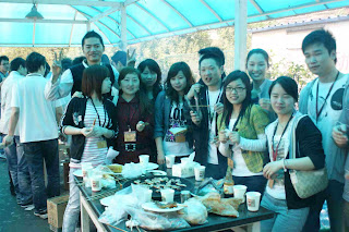 10點所有報名參加活動的同仁于人資中心門口集合,大約十五分鐘後隊伍浩浩蕩蕩地出發了。到了定山湖山莊,輔導員們列隊歡迎60名同仁代表,接著各組輔導員領著自己的組員開始燒烤。