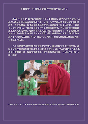 代表PSA完成這一趟救災任務的三位總務部同仁--管紅芝、章劍、王新建,在4/21中午抵達青海玉樹。沿途身體上的高原反應隨著地形變化不斷發生,但三位秉持著「盡快讓災民能有充足的物資」的心,靠著這樣的原動力,完成了3100公里的長征。到了玉樹由公雅寺的喇嘛協助通過檢查站,在公雅寺的救助站卸下了PSA滿載的愛心,巴金仁波切以花環像我們致上災民的感謝。